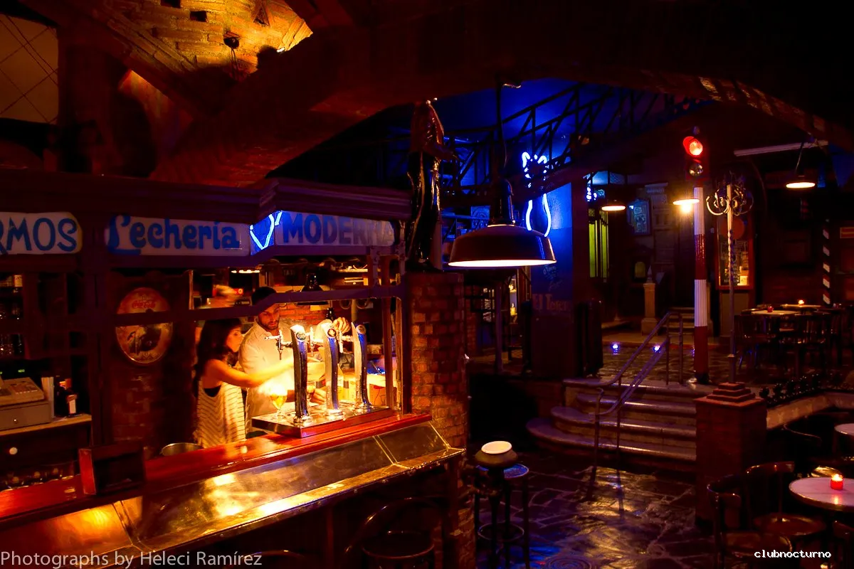 Cerveza de importación y cócteles en pub con arco de ladrillo y decorado con farolas y un semáforo.