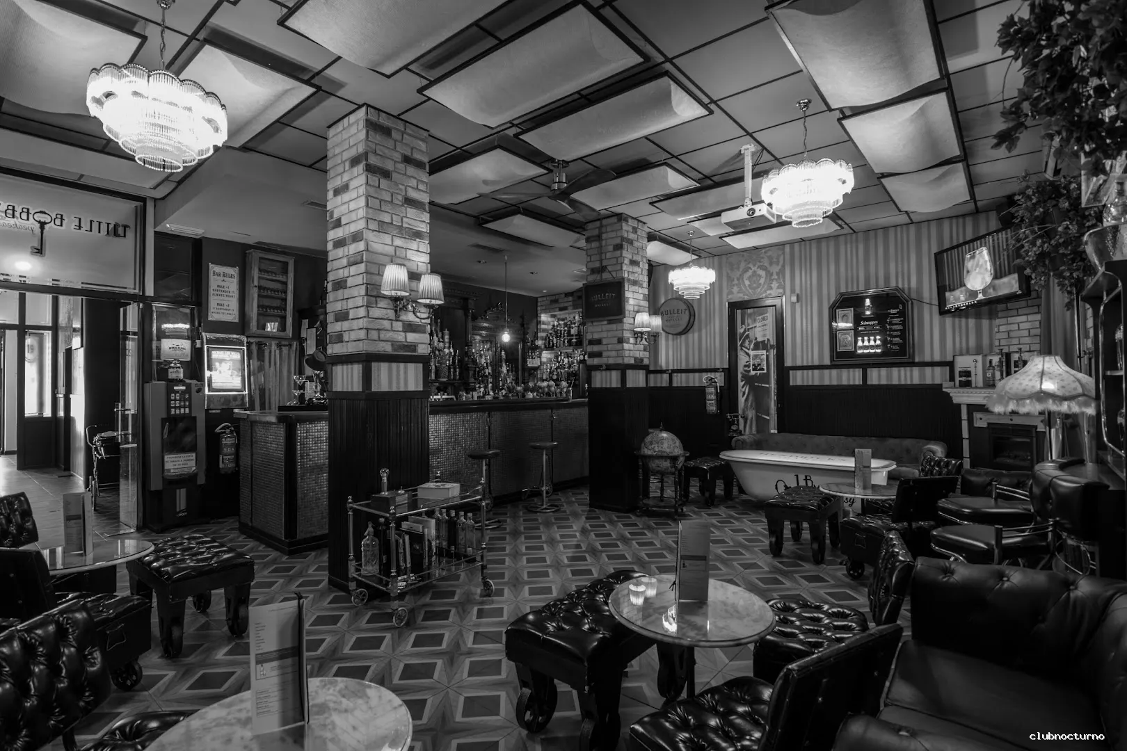 Pub con temática de los años 20, parcialmente iluminado, que sirve una gran variedad de cócteles artesanales, cerveza y vino.