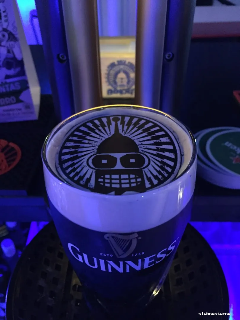 Cerveza internacional, licores y música rock y metal en local con taburetes negros y decorado con vinilos.
