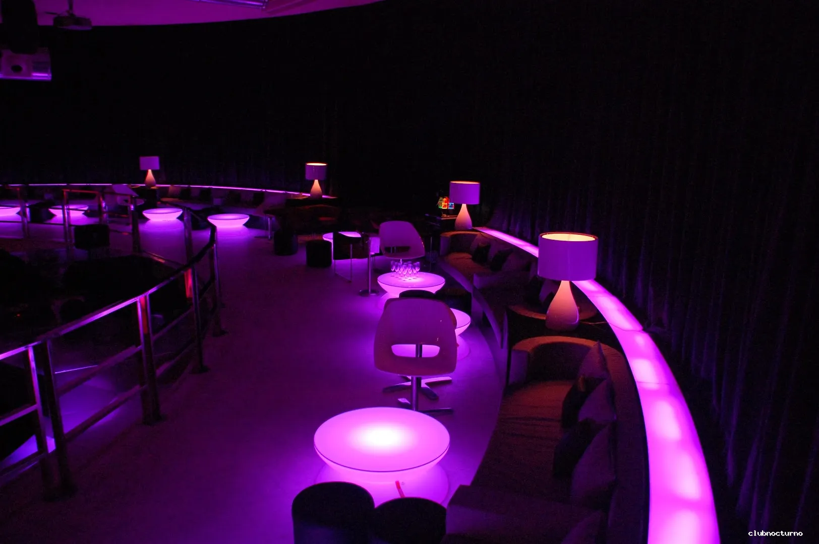 Cócteles y champán en una discoteca chic con decoración futurista, palmeras y techo de cristal en arco.