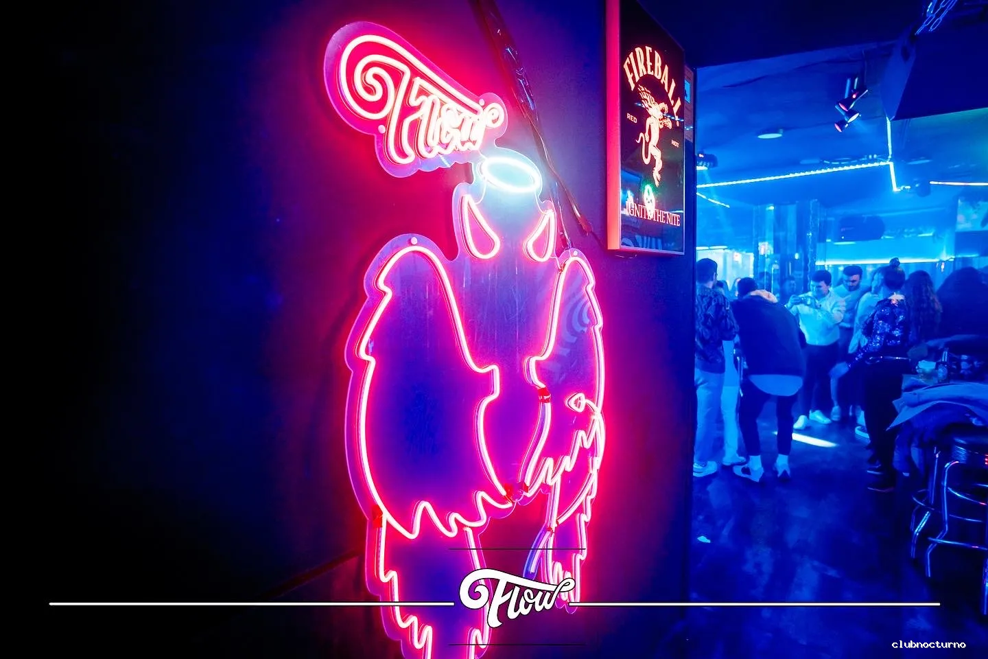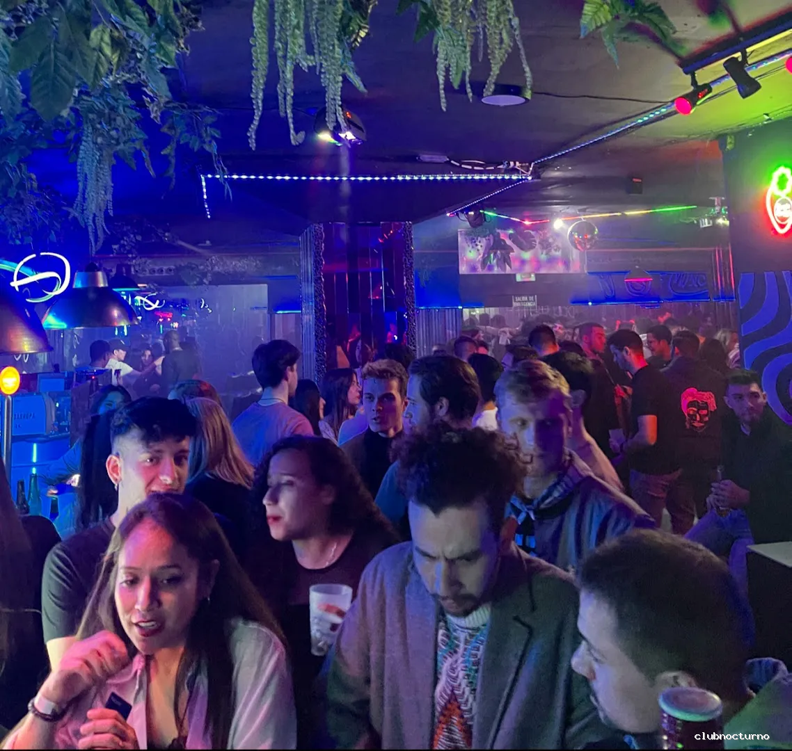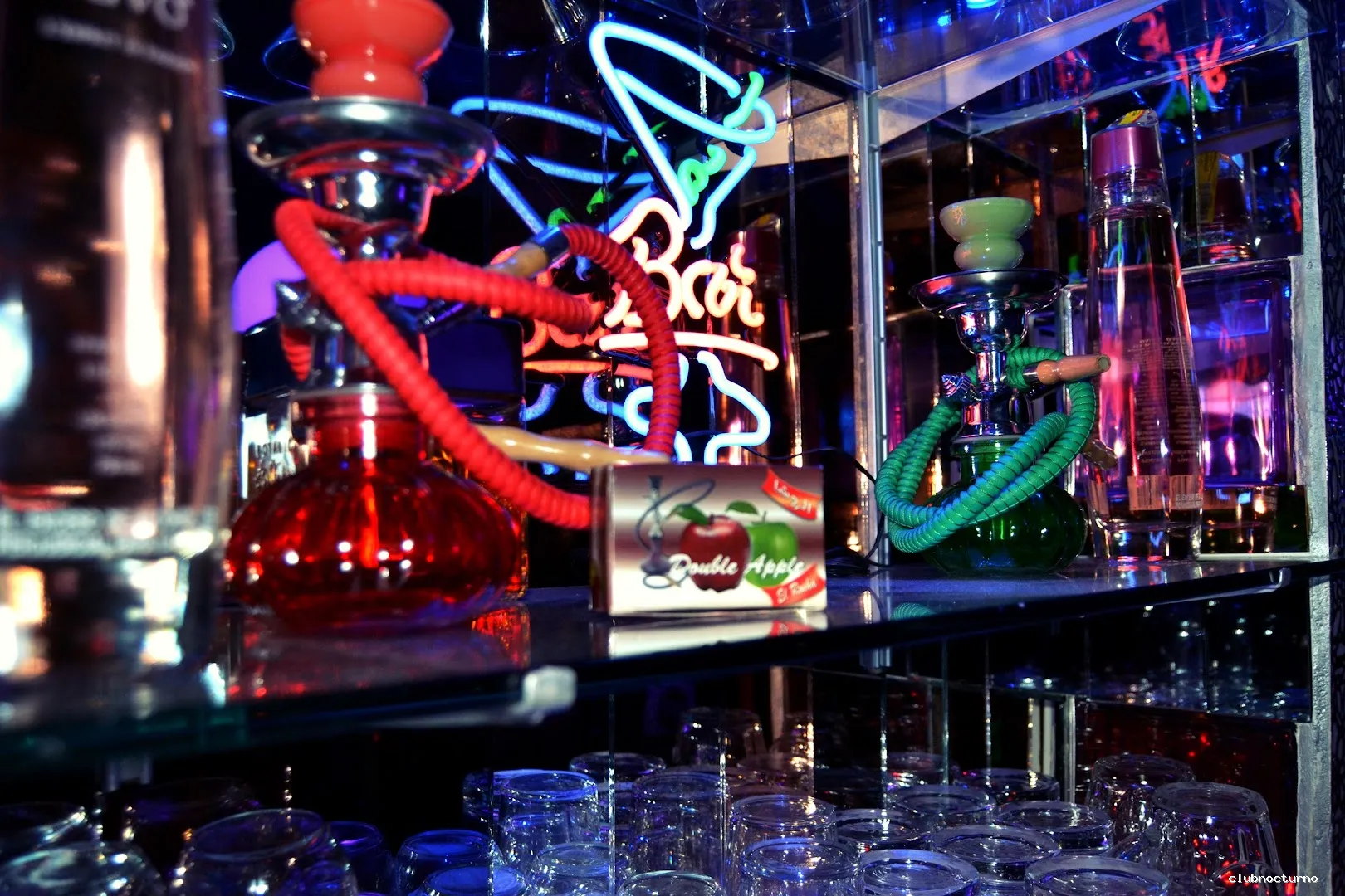 Bar y club animado con cachimbas, cócteles, pista de baile y música house en un ambiente con luces de neón.