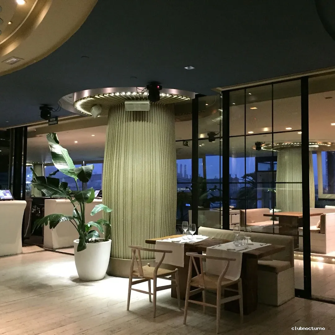 Ambiente chill out, cócteles y restaurante mediterráneo en estilosa sede del famoso club ibicenco.