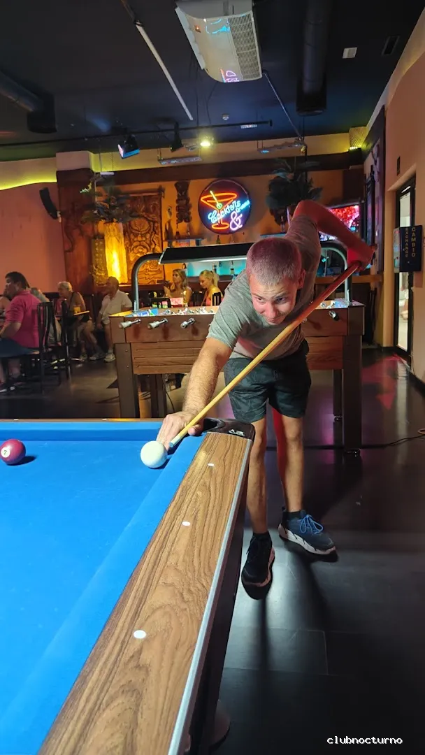 Karaoke con atrezo para el que se anime a cantar en un amplio pub con dos barras largas y una mesa de billar.