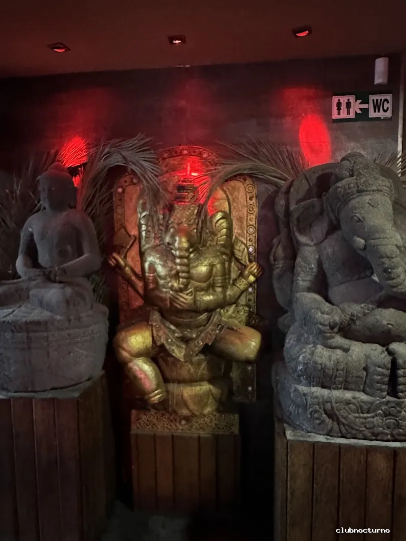 Club de dance comercial con decoración de aire budista y sillones blancos y una amplia terraza con piscina.