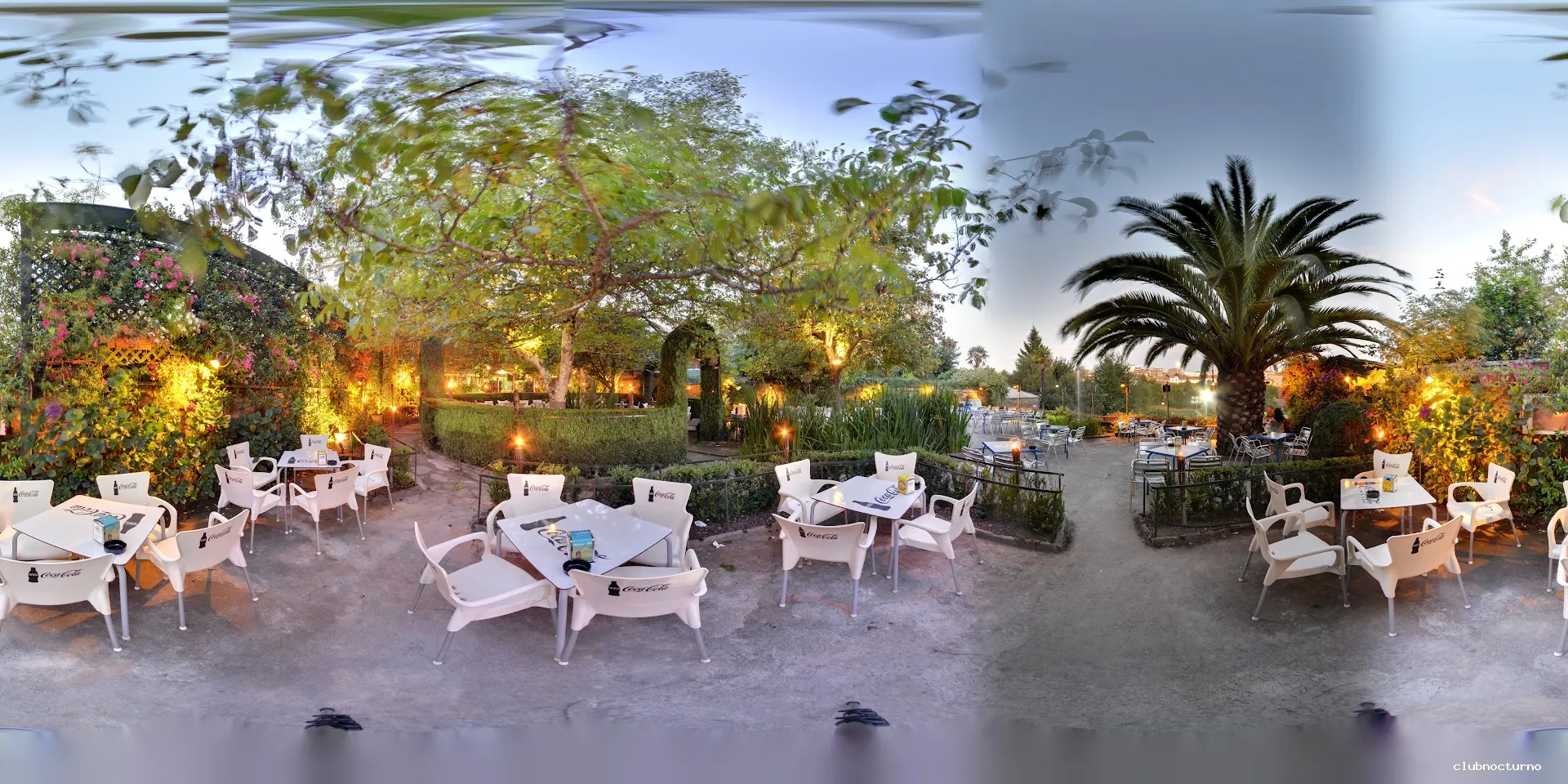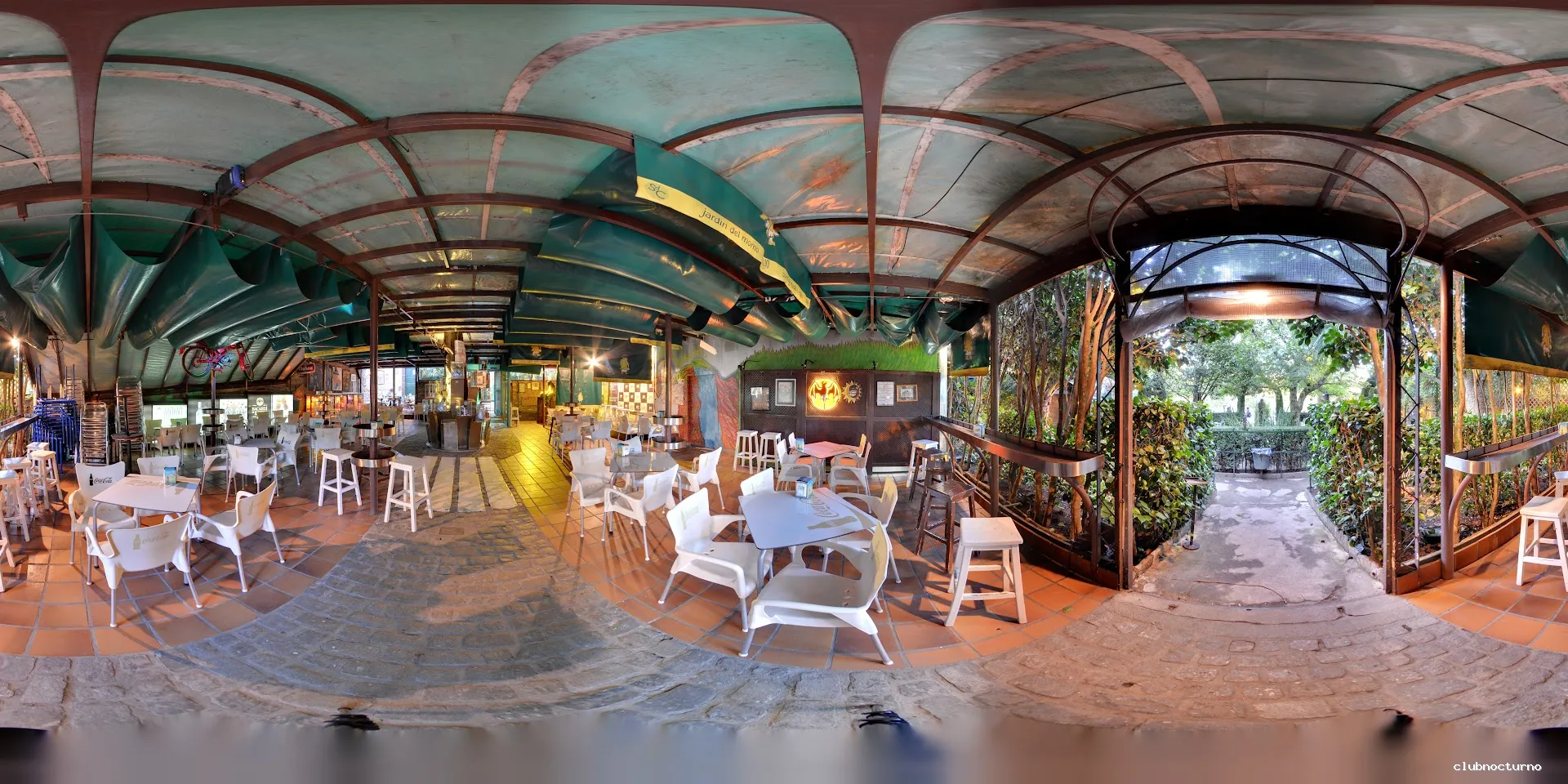 Emblemático local con terraza en un jardín, actuaciones en vivo, decoración temática de Momo y cócteles.