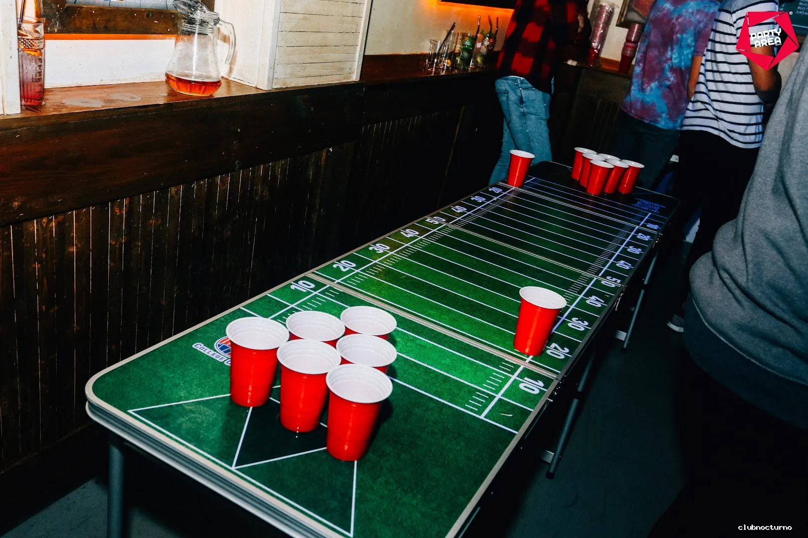 Bar concurrido con chupitos, cócteles de la casa, jarras de sangría, sesiones de DJs y beer pong.