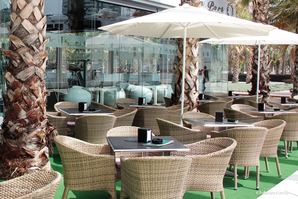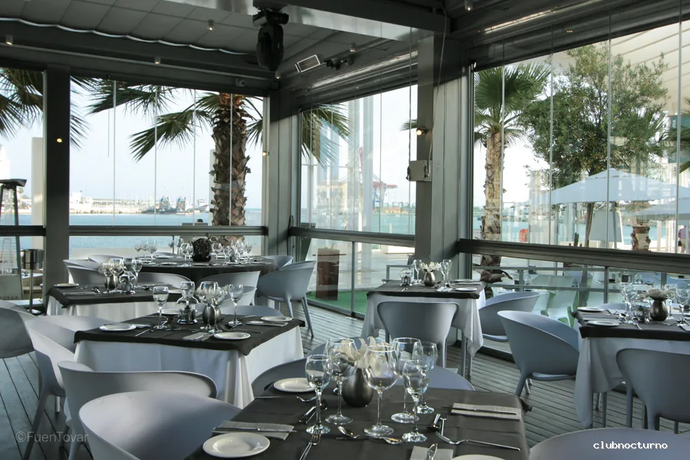 Tapas, cócteles creativos y alta cocina española en una terraza concurrida con vistas al puerto.