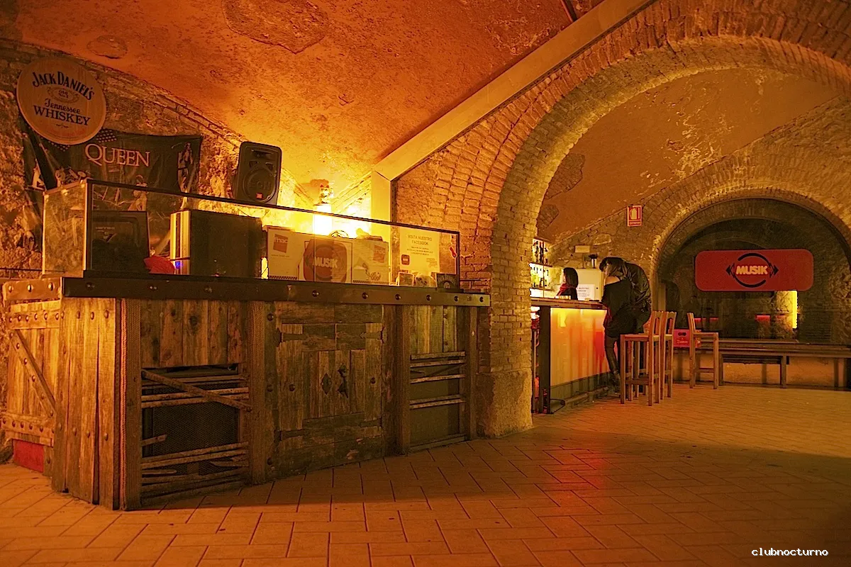Música en directo y discoteca en local con arco de ladrillo y tres salas diferentes más bocatería.